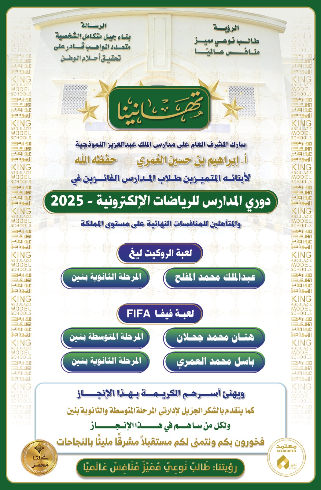 طلابنا يتأهلون لنهائيات دوري المدارس للرياضات الإلكترونية 2025 ..