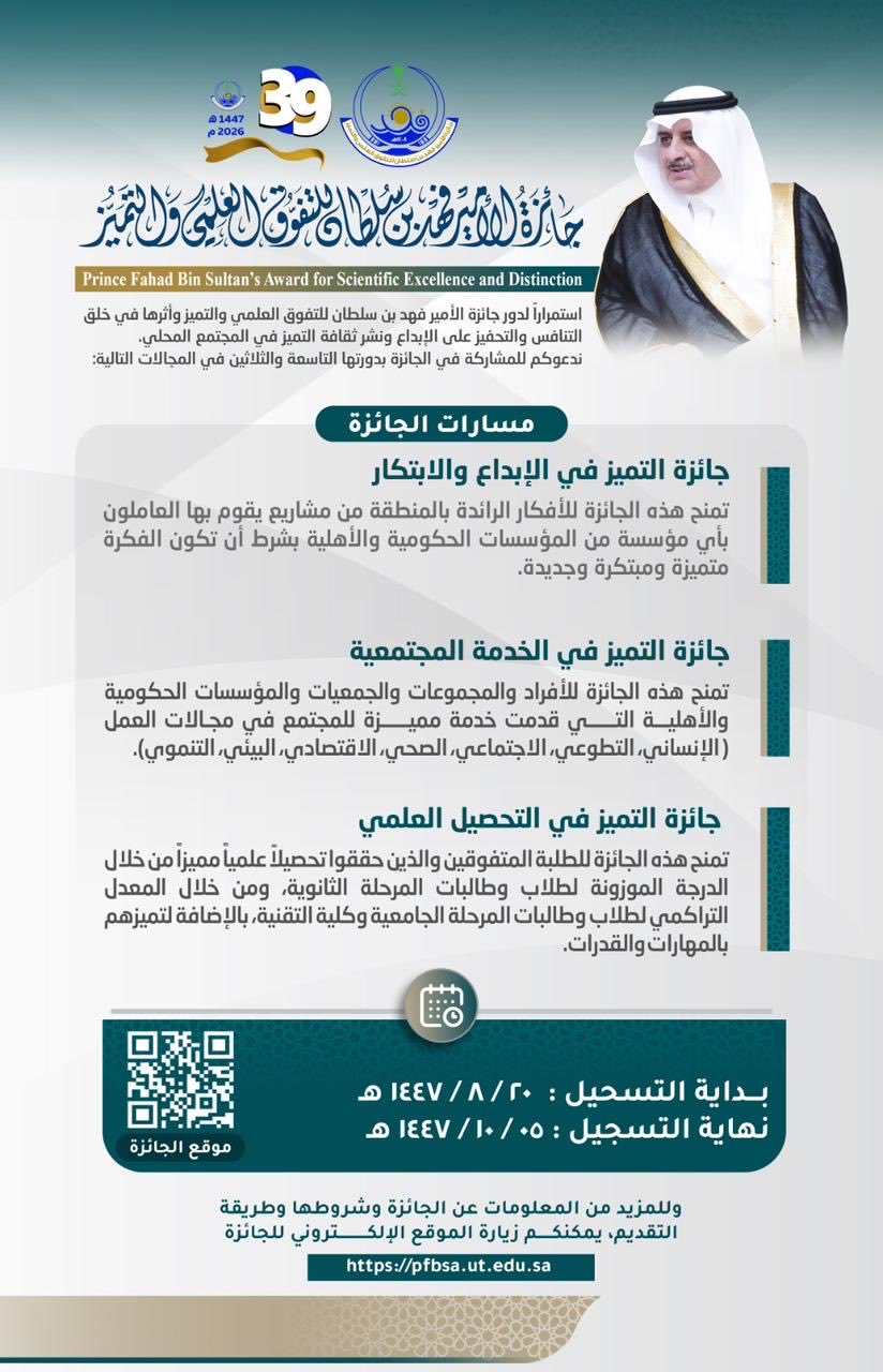 فتح باب التسجيل لجائزة الأمير فهد بن سلطان للتفوق العلمي والتميز ..
