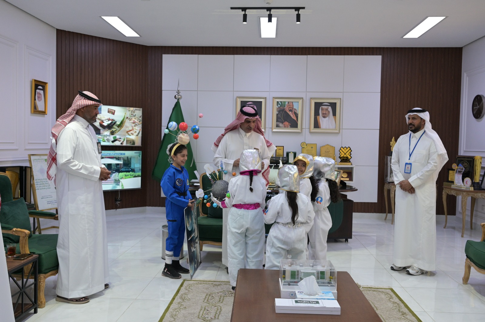 ضمن فعاليات أسبوع الفضاء العالمي، قامت طالبات المرحلة الابتدائية – بنات بزيارة مميزة إلى مكتب المشرف العام على مدارس الملك عبدالعزيز النموذجية، قدّمن خلالها برنامجًا ثريًا تناول معلومات علمية حول الفضاء والاكتشافات الحديثة، واستعرضن فيه شغفهن بالعلوم والبحث والاستكشاف .