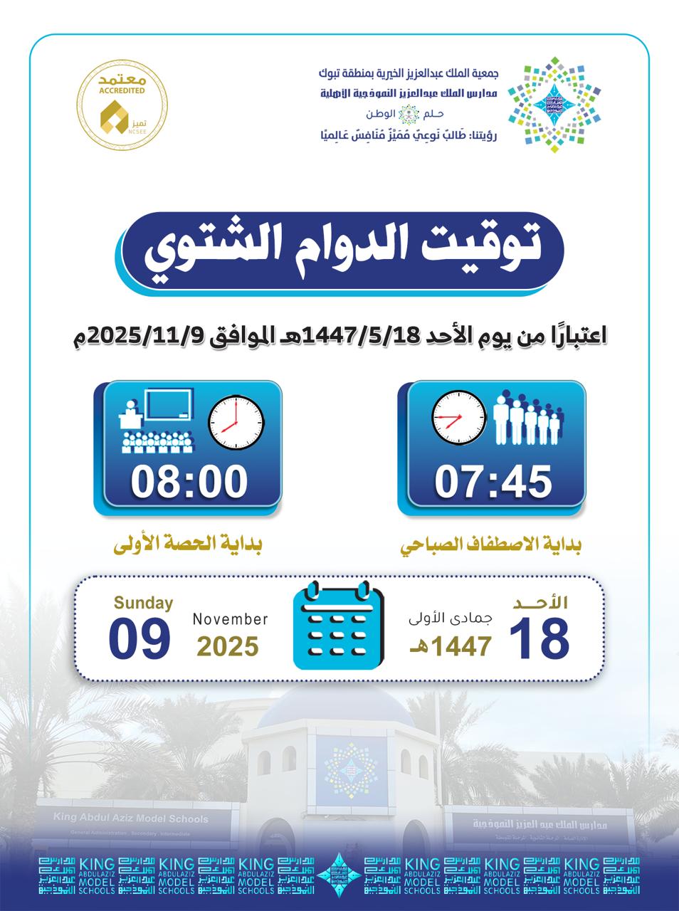 تعلن مدارس الملك عبدالعزيز النموذجية الأهلية بتبوك عن تطبيق توقيت الدوام الشتوي ابتداءً من يوم الأحد 18 جمادى الأولى 1447هـ الموافق 9 نوفمبر 2025م، وذلك على النحو التالي: