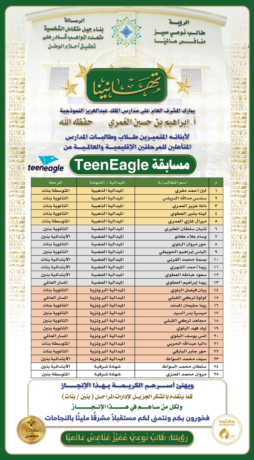 تهانينا لطلابنا الفائزين ، مسابقة TeenEagle هي من المسابقات النوعية التي تهدف إلى تنمية مهارات التفكير والتحليل، وتعزيز روح التحدي والمنافسة الإيجابية لدى الطلبة، من خلال اختبارات ومعايير تقيس القدرات الذهنية والمهارية،في مختلف المراحل التعليمية.