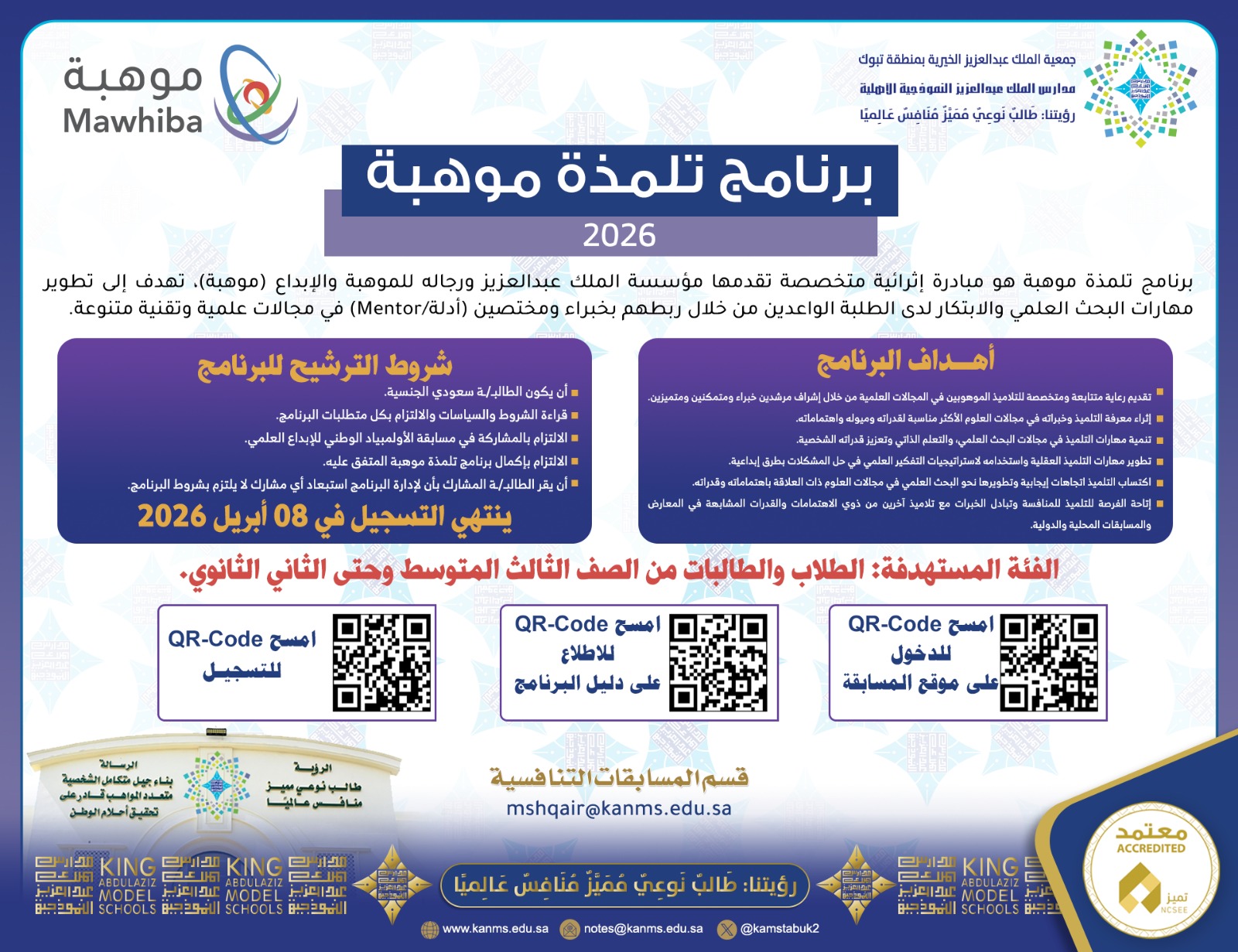 تعلن مدارس الملك عبدالعزيز النموذجية بتبوك، بالتعاون مع مؤسسة الملك عبدالعزيز ورجاله للموهبة والإبداع "موهبة"، عن إطلاق برنامج تلمذة موهبة 2026، والذي يُعد مبادرة إثرائية متخصصة تهدف إلى تنمية مهارات البحث العلمي والابتكار لدى الطلبة الموهوبين، من خلال ربطهم بخبراء ومختصين (Mentor) في مجالات علمية وتقنية متنوعة.